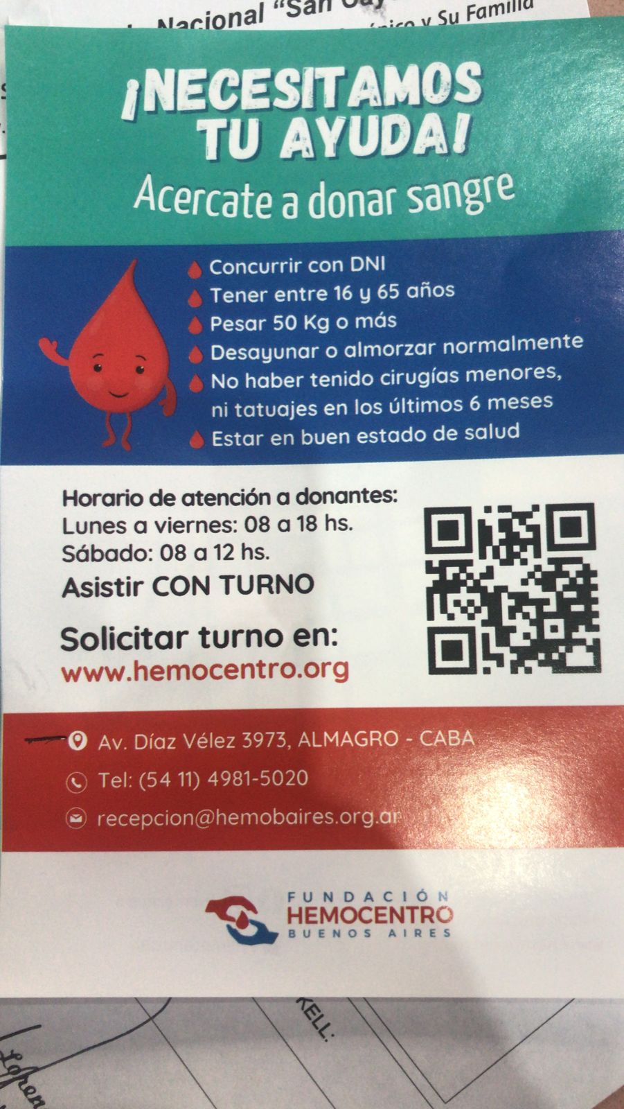 El horario de atención a donantes es de lunes a viernes de 08 a 18hs., sábados de 08 a 12hs.