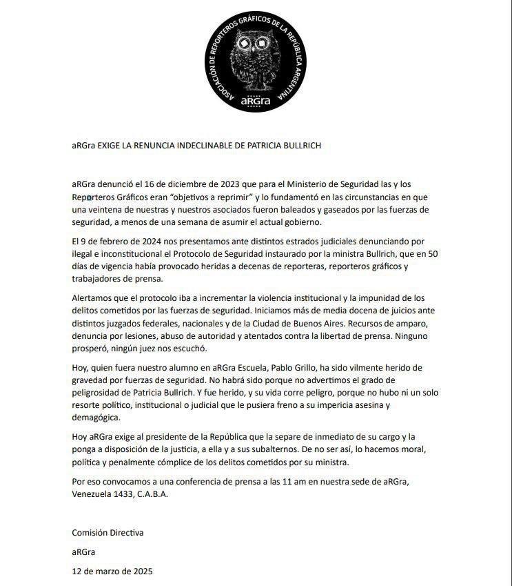 aRGra denunció el 16 de diciembre de 2023 que para el Ministerio de Seguridad las y los Reporteros Gráficos eran "objetivos a reprimir" y lo fundamentó en las circunstancias en que una veintena de nuestras y nuestros asociados fueron baleados y gaseados por las fuerzas de seguridad, a menos de una semana de asumir el actual gobierno.