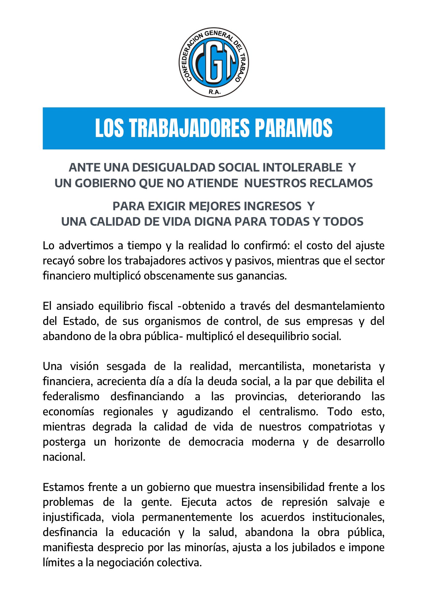 Compartimos Comunicado oficial de la Confederación General de Trabajadores de la República Argentina.