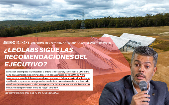 En relación a la empresa responsable de la antena radar, Dachary expresó que el 95% forma parte de una empresa de origen irlandés y el 5% es una empresa del Reino Unido. “Para nosotros esto, más allá de las decisiones finales que tome el Gobierno Nacional, sí debería ser modificado, porque es una incongruencia estar de cierta manera favoreciendo el desarrollo económico de una empresa británica con generación de información, más allá de que no sea militar, desde la provincia de Tierra del Fuego” consideró.