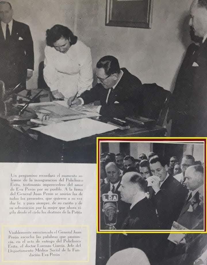 Después Alejandro Apold, le entregó a Perón un medallón de oro acuñado por la Sra. Eva Perón antes de su muerte, en nombre de la Fundación. A continuación habló el Dr. Lorenzo García, jefe del Departamento Médico-Social de la Fundación. Cuentan las crónicas de la época que sus palabras sobre Evita, llenaron de emoción al Presidente Perón y comenzó a llorar. La foto (recuadro) lo muestra secándose las lágrimas con su pañuelo.