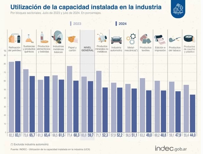 El INDEC informó que la utilización de la capacidad instalada industrial fue del 59,7 %. La cifra es considerablemente inferior a la del mismo mes del año anterior.