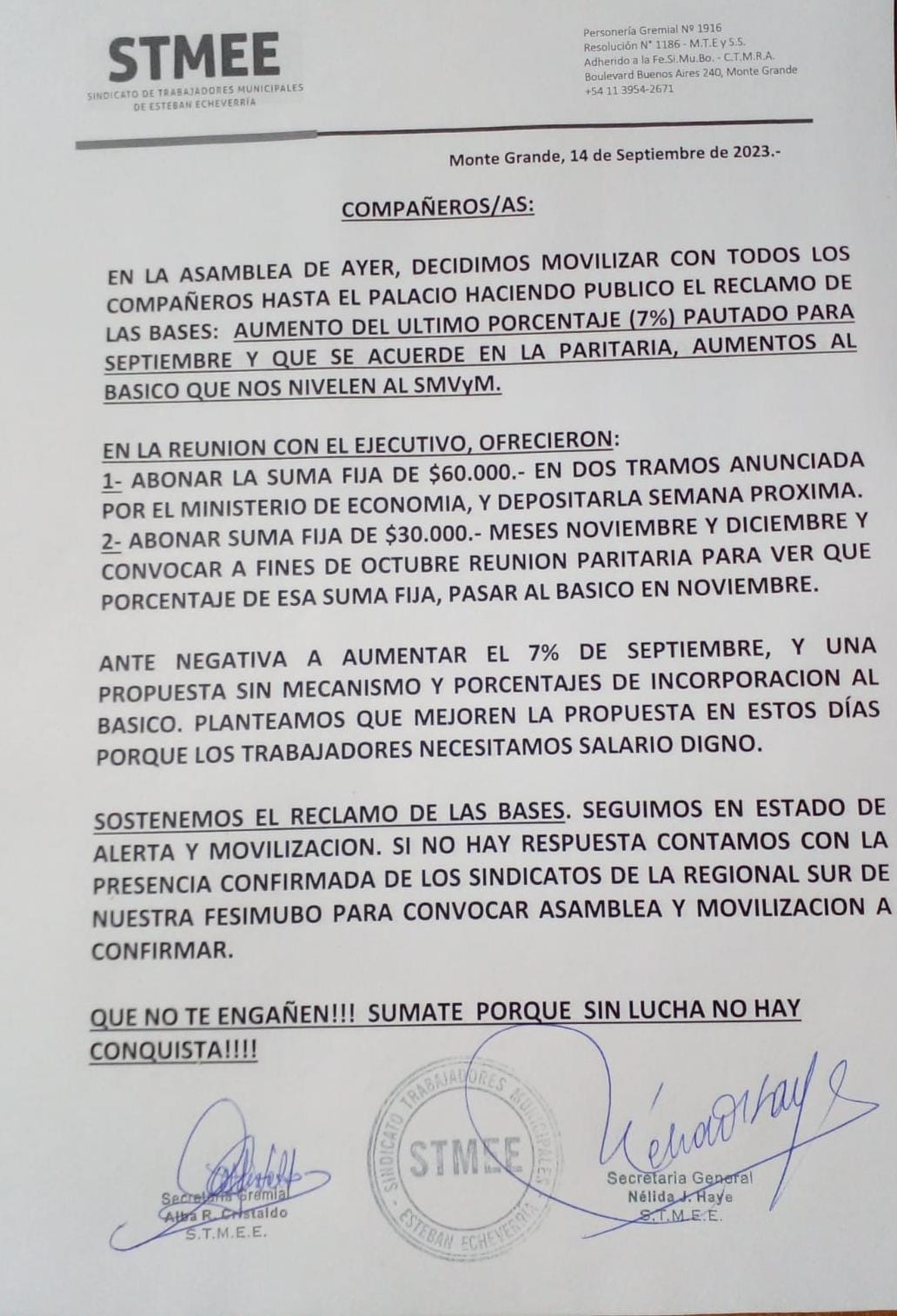 Nuevamente los trabajadores municipales de Esteban Echeverría están en lucha para lograr salarios dignos. Asambleas, movilizaciones y la inminente presencia del FESIMUBO intentarán que el intendente Fernando Gray entre en razones y normalice una situación no deseable.