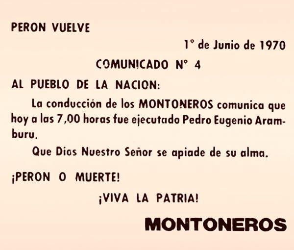 A los dos días, un comunicado de un grupo denominado Montoneros anuncia que se ha llevado al ex dictador para realizarle un juicio revolucionario. Lo acusan por el derrocamiento de Perón, el robo del cadáver de Evita y los fusilamientos de 1956. El 1º de junio Aramburu fue ajusticiado.