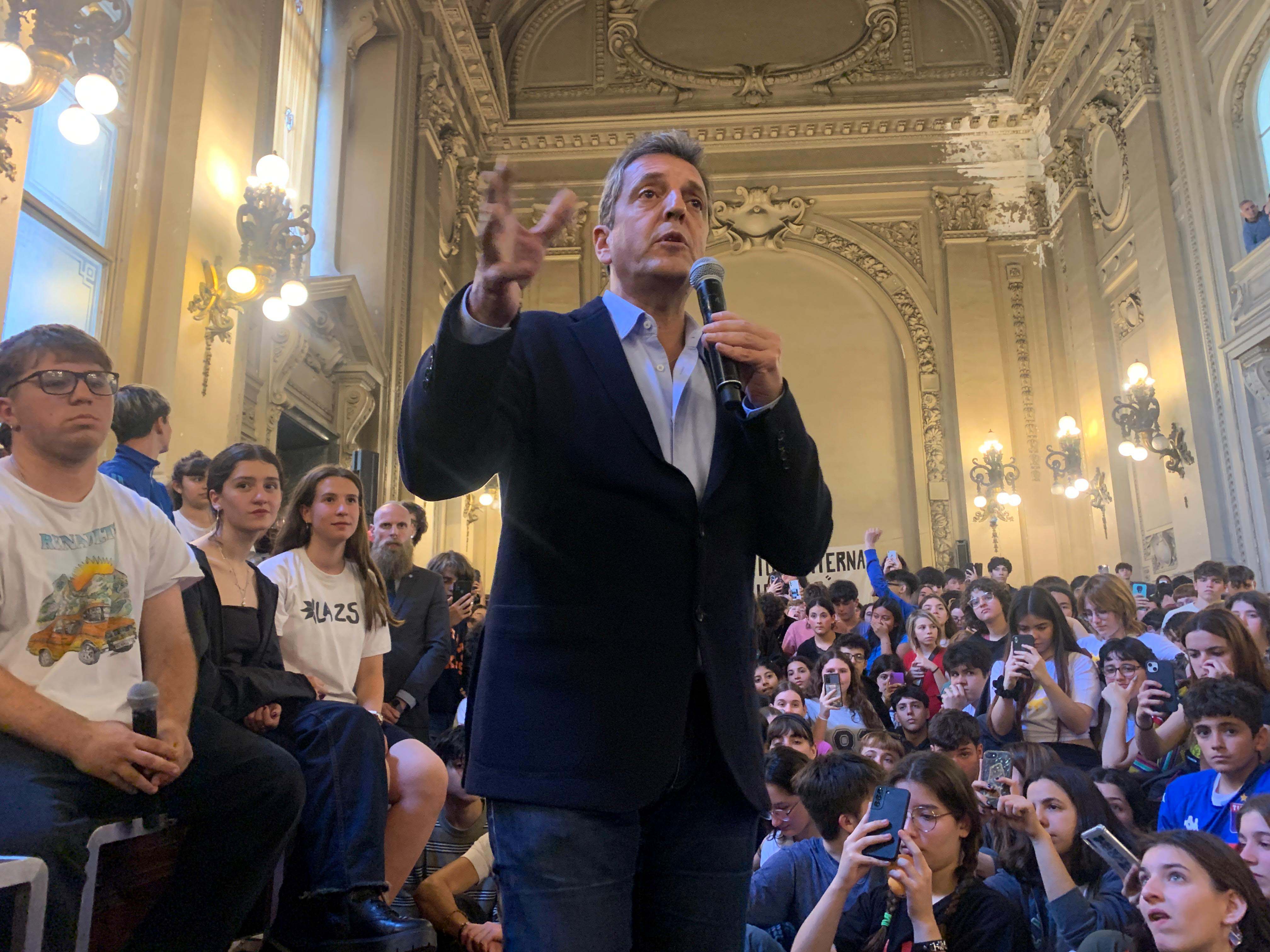 Durante casi dos horas, el ministro de Economía expuso y fue interpelado por un desbordante auditorio de estudiantes que había esperado su llegada entonando las estrofas de la Marcha Peronista y que, por momentos, lo interrumpió cantando "presidente...Massa presidente".