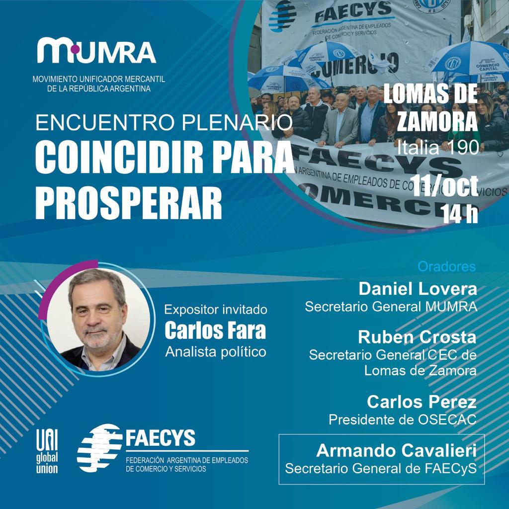 Con el nombre “Coincidir para prosperar”, el encuentro contará con las exposiciones de Carlos Pérez, Presidente de OSECAC, la obra social de los empleados de comercio, Daniel Lovera, Secretario General del MUMRA y del Sindicato de empleados de comercio de Gral. Pico (La Pampa) y Rubén Crosta, Secretario General del CEC de Lomas de Zamora. A ellos se agregará el consultor político Carlos Fara, quien hablará sobre la actualidad política de nuestro país. El cierre estará a cargo de Armando Cavalieri, Secretario General de FAECYS.